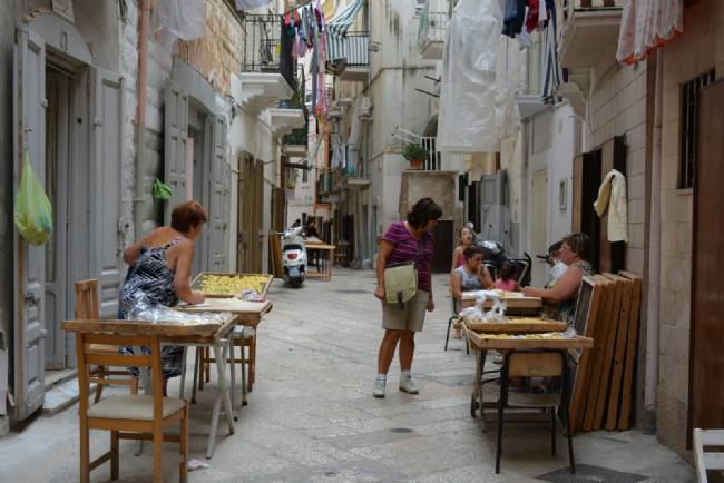 Italia, signore dei borghi di Bari impegnate a preparare le orecchiette tipica pasta fresca pugliese.