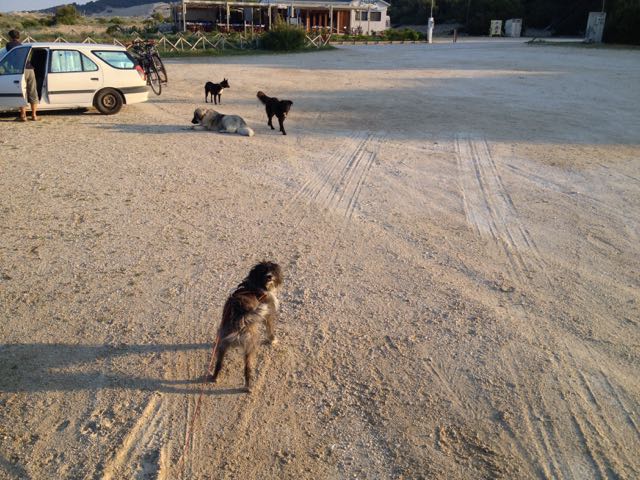 I cani greci hanno imparato a riconoscere i camper: a noi è successo che vedendoci arrivare ci correvano incontro scodinzolando e leccandosi i baffi, come se sapessero benissimo che su questi veicoli bianchi e grossi si mangia e avanza sempre qualcosa anche per loro.