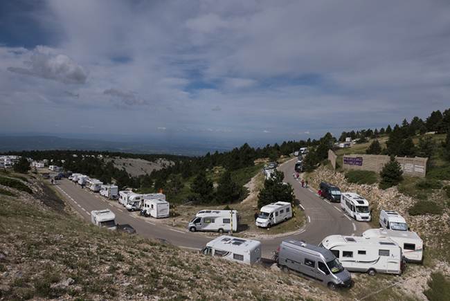 Tante emozioni e tantissimo vento! Noi siamo arrivati il lunedì mattino a Sault. Nel pomeriggio andiamo in bici a Chalet Reynard per vedere com'è la situazione. Strada bellissima in mezzo ai boschi e campi di lavanda all'inizio. Arrivati su decidiamo di venire su nel piazzale dove ci sono ancora dei posti in mezzo a un'infinità di camper (nei giorni successivi si riempirà del tutto). Quindi dopo aver fatto a tutta la discesa, facciamo carico/scarico, un pò di spesa e rifacciamo i venti chilometri questa volta col camper. Ci troviamo un bel posto a ridosso degli alberi, per fortuna perchè nei due giorni successivi ci proteggerà dal vento fortissimo. Il martedì mattina andiamo a piedi verso la vetta e dopo circa tre chilometri vediamo che potremmo stare qui sulla strada, sembra tranquillo, non c'è vento. Alla fine decidiamo di non spostare il camper, anche perchè eravamo già sistemati.Riusciamo ancora a fare una grigliata, dopo di che tolto il tavolino, la veranda e chiusi dentro scossi che sembrava di essere in barca.Per fortuna il giovedì è migliorato e siamo riusciti a vedere la gara.