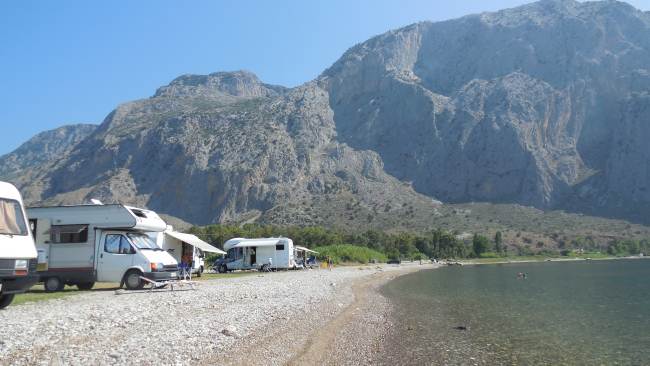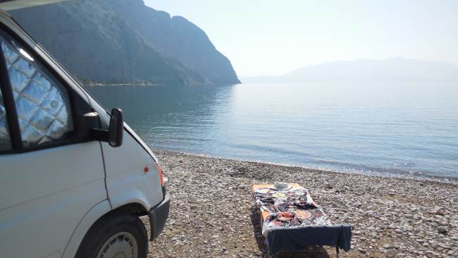 Il profilo che si vede nella foto non è Kerkira, ma è il Peloponneso visto da Nord: ho il muso del camper che punta a Sud. Quella è la spiaggia di Krioneri, un piccolo villaggio tra Antirrio e Mesolongi. La zona dovesi sosta col camper è a qualche centinaio di metri a Ovest del centro abitato. Camperisti italiani che sostavano lì da più giorni mi dicevano che nessun locale si era mai lamentato, forse perchè la spiaggià è estesa e poco frequentata. E' l'unico posto in Grecia dove ho visto tendalini aperti in tranquillità... Un saluto a tutti... al prossimo punto-sosta!