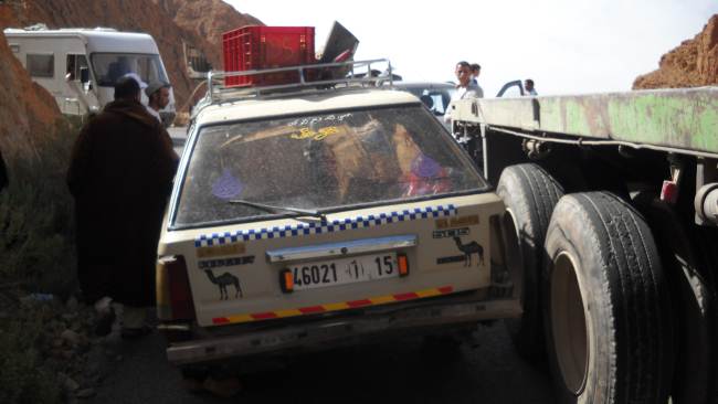 ciao a tutti, l'anno scorso, proprio discendendo le gole di Dades, abbiamo un'articolato davanti, che ovviamente prende le curve larghe...il taxi che vedete a sx, ha superato, contromano in curva, all'inglese....per fortunaè rimasto incastrato tra roccia e camion, perchè noi stavamo arrivando sulla ns. corsia.....mai come in questo caso, la fortuna ci ha aiutato....ciao Tony L''uomo non smette di giocare perché invecchia, ma invecchia perché smette di giocare. (George Bernard Shaw)