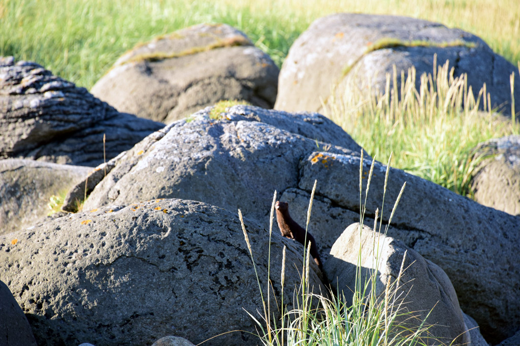 Sempre a Eggum, mentre passeggiavamo la mattina presto fra i roccioni della spiaggia, è saltato fuori un visone che ha giocato per qualche secondo a rimpiattino... La foto non è venuta un granché, si è poi infilato sotto una roccia causando un fuggi fuggi di uccellini dall'altra parte... Visone a Eggum Ciao da Dash