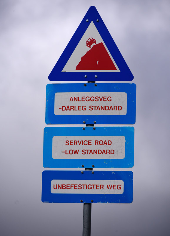 Strada dissestata, nello Jotunheimen Ogni tanto capita di incontrare un cartello come questo, non capita se ci si attiene alle strade principali, però in zone secondarie se la quantità buche e sassi diventa intollerabile, allora avvertono prima! La macchina in bilico sul precipizio chiarisce bene il concetto... Ciao da Dash