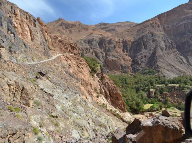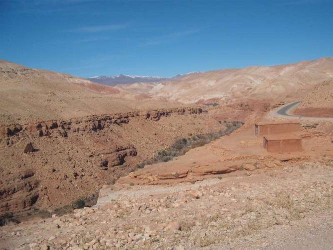 Vedo che sulla carta la strada che citi che si stacca dalla N12 poco dopo il bivio per Amtoudi e passa per Aguerd , Im Ouzlag , termina a Tamessoult , dopo non è più indicato nulla neanche una pista . Comunquevedo su un piccolo depliants che avevo rimediato a Tafraoute che il raccordo con le gorges di Ait Mansour esiste ma è essenzialmente sterrato . Non voglio immaginare che sia la fotocopia della pista che scende parallela , poco più a est ,dalle gorge fino alle incisioni rupestri di Ukas che io ho percorso su un 4 x 4 . Questa pista che corre nel greto dell' ouadi è in condizioni pazzesche e non voglio immaginare di doverla percorrere con il mio MH , troppo basso . So della strada R 307 che da Demnate porta nei pressi di Ouarzazate : mi hanno riferito che è molto impegnativa e nella stagione invernale-primaverile , può essere interrotta per neve e/o frane dovendo superare tre colli difficili di cui uno a 2.580 metri . Con il mio mezzo , non voglio rischiare di trovarmi bloccato in condizioni difficili . Ho anche in programma la valle di Telouet che risale da Ait Benhaddou che mi dicono fantastica ed estremamente selvaggia . Io non sverno come tanti che passano mesi e solitamente lo fanno per la pesca nell'estremo sud del Paese . La pesca non mi interessa e sinceramente i paesaggi piatti e desertici del sud non mi dicono nulla ; sono sceso anni fa fino alla laguna di Naijla poco prima di Tarfaya ma non lo ripeterò . Mi interessa scoprire l'interno e lo farò nella stagione primaverile ( marzo-aprile ) quando i rischi di trovare neve e strade dissestate sono meno evidenti dopo aver passato i primi tempi lungo l'oceano a scendere tranquillamente . Magari ci si incontra per una sana bevuta in compagnia . Buon viaggio , Piero