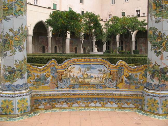 Napoli, panchina rivestita di piastrelle dipinte in maiolica nel chiostro del monastero di Santa Chiara.