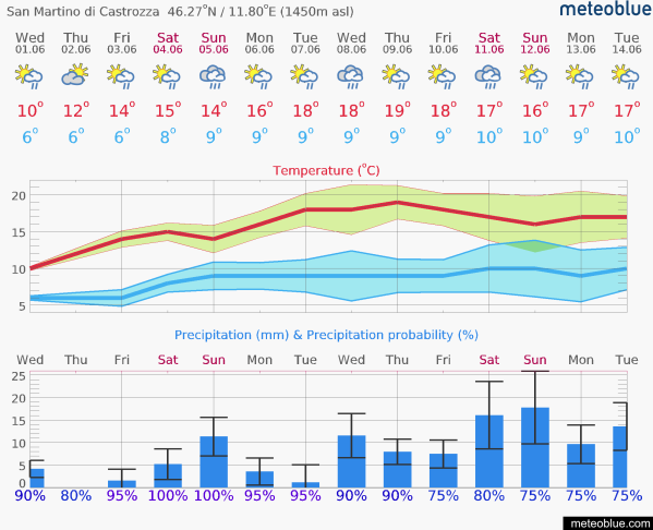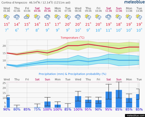 da alcuni giorni pensavo di aprire un topic sul tema ma rimandavo sempre. Oggi pero' sono stato stuzzicato da un forumista e dumque lo apro. da diversi anni non riesco ad andare sulle dolomiti per il tempaccio estivo.Come mai la meteo dolomitica e' cambiata ? guardate un po' le webcam sulle tre cime: nuvole, nient'altro che nuvole e nebbia. qui le previsioni per 15 giorni per cortina e san martino di castrozza: Le previsioni di misurina le tralascio volontariamente perche' mi fu detto che e' un posto difficile da prevedere. Ora sono a casa ad aspettare che le cagne vadano in calore (previsto per il 10 giugno). A fine luglio a calore finito ci sara' il bel tempo sulle dolomiti ? aggiornero' il topic con previsioni del tempo e foto da webcam durante l'estate.