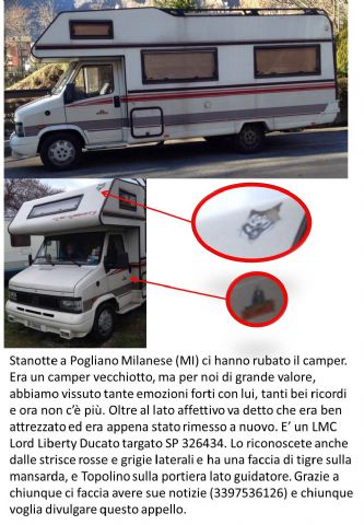 | CB495EB | CI su Fiat Ducato | Roma capitale, centro | 26 giugno 2021 | Era parcheggiato nei parcheggi a pagamento di viale Marco Polo, a Roma. Ci siamo spostati solo per una passeggiata mattutina e pranzo fuori perchè in camper troppo assolato... mancavamo da non più di tre ore. Siamo disperati per come è potuto succedere, un bestione bianco di più di sette metri. Aiutateci, purtroppo è molto probabile che ce l'hanno sottratto gli zingari del campo rom di Roma nel quale hanno paura ad entrare anche le forze dell'ordine... testuali parole dei Carabinieri di Roma. | polpetta71Visita il profilo Invia una mail Tel. 3293460058 |