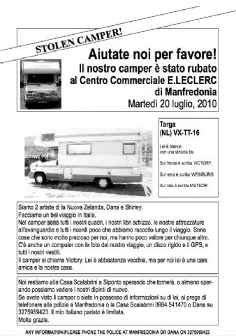 Il suo camper (Citroen Jumper) è stato rubato nel giro di un'ora durante una breve sosta a Roma. Potete immaginare cosa significhi per lei e la sua famiglia.