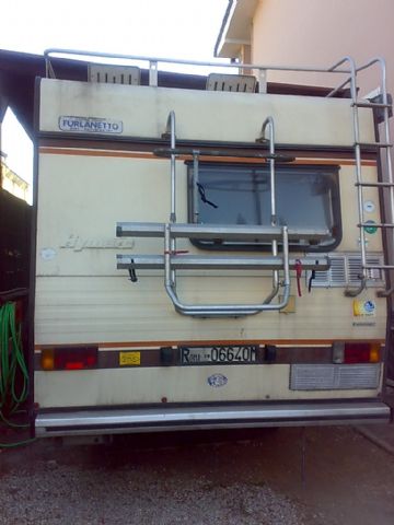 In alluminio, con gavone sul tetto lato guida, pannello solare lato passeggero, probabilmente con la serratura del gavone garage forzata, attacchi per porta bici o eventuale porta bici 4 posti, veranda Fiamma |