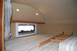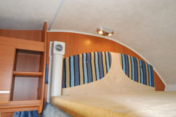 E’ ora, però, di tornare ad analizzare, questa volta dall’interno, la mansarda. Il primo, semplice, passo, consiste nell’avvicinarsi a questa e di verificarne l’altezza da terra: a seconda della meccanica di base impiegata, del taglio o meno del padiglione, della presenza di un dislivello cabina/abitacolo accentuato o meno, questo valore può cambiare significativamente. La media attuale è di poco superiore ai 155/160 cm: un valore tutto sommato corretto, che pur imponendo l’utilizzo di una scaletta, peraltro in dotazione, non pone eccessivi problemi. Esistono, però, casi in cui l’altezza da terra della mansarda raggiunga addirittura i 180 cm: è un valore elevatissimo, probabilmente spropositato, che rende il letto matrimoniale superiore veramente difficile da raggiungere. Pensiamo, infatti, alla necessità di dover scendere durante la notte, magari per accudire un bimbo: deve essere possibile scendere in tutta sicurezza, magari anche assonnati, senza rischiare infortuni!