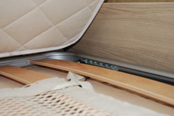 Alziamo i materassi della mansarda e controlliamone lo spessore: si va da un minimo “sindacale” di 8 cm a oltre 15 negli allestimenti di altissima gamma. Cerchiamo, inoltre, le chiusure lampo laterali delle fodere, e apriamone una: ci servirà per controllare sia la qualità delle fodere, sia soprattutto il materiale e la consistenza delle imbottiture sulle quali dormiremo. Sempre sotto al materasso verifichiamo la presenza della rete anticaduta, ormai obbligatoria, e la costruzione delle sponde del letto, argomento importante e delicato ma spesso un po’ tralasciato.