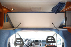 Una mansarda eccessivamente presente, e quindi “schiacciata” sulla cabina, ha influenze negative sulla visibilità e sulla facilità di guida, con pericolosi angoli morti frontali nella parte alta del veicolo. Sempre alla guida, controlliamo che la visibilità laterale fornitaci dagli specchi sia sufficiente e che questi inquadrino a dovere l’intera fiancata e che il raccordo cabina/abitacolo rientri il meno possibile nella focale degli stessi. Sempre in cabina, proviamo a raggiungere l’abitacolo: prima di alzarci in piedi, però, controlliamo l’altezza a nostra disposizione e se il veicolo che stiamo visionando sia dotato, o meno, di padiglione tagliato. La meccanica attualmente più utilizzata, il Fiat Ducato, ha un’altezza interna di circa 153 cm: per quanto buona, quest’altezza impedisce ai più di mantenere una posizione eretta. Come accennato pocanzi, molti costruttori ricorrono al taglio del padiglione al fine di aumentare questo valore. Verifichiamo, quindi, che la rifinitura interna sia corretta, con uno stampo plastico o un rivestimento imbottito in tessuto e, magari, la dotazione di una tenda a giro per separare i sedili e assicurare la necessaria privacy in sosta senza necessità di ricorrere sempre agli oscuranti. Prima di abbandonare il posto di guida controlliamo la rifinitura del letto superiore: la cosa più semplice, e quindi più diffusa, è la classica rete a doghe scorrevole o incernierata al fine di permetterne il sollevamento. Di queste soluzioni la prima è decisamente più semplice e scomoda: per giovare di un passaggio di adeguate dimensioni, infatti, è necessario scombinare sensibilmente il letto, facendo scorrere le due reti e posizionando i relativi materassi l’uno sopra l’altro. Molto meglio, invece, il sistema con rete incernierata e mantenuta da due pistoni a gas: in questo modo sarà sufficiente alzare la rete senza intervenire sui cuscini. Controlliamo, però, che questa abbia il necessario isolamento rispetto alla cabina: molti allestimenti, infatti, optano per un elegante rivestimento in tessuto, spesso mantenuto da velcro, che fornisce sì un’ottima impressione in quanto a stile, ma che ben poco fa contro il freddo o il caldo proveniente dalla cabina di guida.