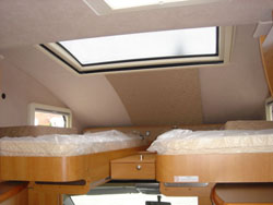 Quando osserviamo la mansarda controlliamone l’aerazione: sono solitamente presenti una o due finestre e un oblò centrale. Le finestre raramente danno problemi: questo non sempre si può dire degli oblò, che a seconda del modello impiegato, possono essere una vera e propria fonte di poco piacevoli spifferi durante la stagione fredda. Controlliamo, quindi, che siano di adeguata qualità e che, possibilmente, siano dotati di guarnizione di battuta. Dedichiamoci, infine, agli oscuranti: chiudiamoli tutti, in modo da creare il buio. Fermo restando che un po’ di luce passerà in ogni caso dall’interstizio tra telaio e telo, è importante verificare che non vi siano chiarori equivoci in altre parti della scocca, tetto e frontale in particolare, specie se di forma elaborata e tondeggiante. Un chiarore, più o meno evidente, in questa zona, sarebbe un campanello di allarme importante riguardo alla coibentazione di tutta questa zona.