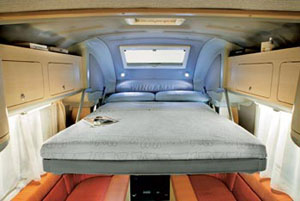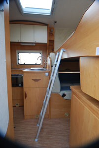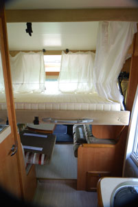 Si tratta, evidentemente, di valutazioni personali che variano da veicolo a veicolo e secondo le esigenze di chi osserva. Del letto superiore, inoltre, sono da controllare la presenza di rete a doghe e la qualità dei materassi, la presenza di adeguate aerazioni (oblò), di punti luce e di portaoggetti a servizio degli occupanti. Verifichiamo l’accesso, spesso servito da una scala, e la fruibilità interna del veicolo con letto abbassato: non è infrequente, infatti, che il letto occupi, parzialmente o meno, la porta di ingresso, limitando la possibilità di uscire o entrare dal camper.
