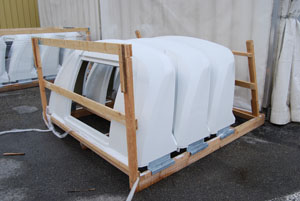 Ultima soluzione, più onerosa e destinata a veicoli di grande levatura, la costruzione di un insieme cupolino/calate stampato in vetroresina monoblocco a doppio strato coibentato con poliuretano e termanto a seconda che si tratti di zone piane o curve. Si tratta, come è facile intuire, di una soluzione più onerosa, del tutto assimilabile per tecnologia e complessità, alla realizzazione di una parte di una monoscocca in resina. Come è facile intuire, però, una soluzione di questo tipo garantisce le migliori performance di rigidità strutturale, coibentazione e solidità, ma ha, ovviamente, un peso maggiore. L’interno, in questo caso, è o abbinato a uno stampo in abs, o rifinito all’interno tramite un feltro o un’imbottitura in tessuto.