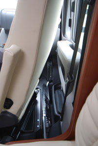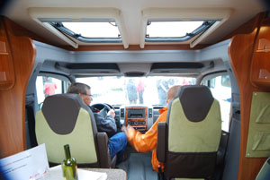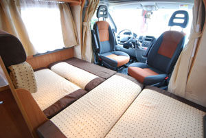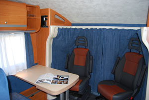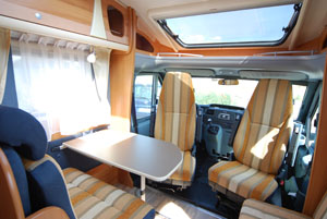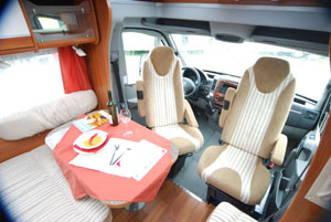 I profilati attuali utilizzano, tutti, la cabina di guida. Questa è parte integrante dell’abitacolo, e deve offrire quindi lo stesso grado di comfort. Controlliamo pertanto che le poltrone girevoli siano comode e facili da approntare per la sosta e per il viaggio, che presentino le fodere coordinate con la tappezzeria interna, a suggellare una migliore unione tra i due ambienti, che il dislivello tra cabina e abitacolo non sia tale da inficiare la raggiungibilità del tavolo del living da parte degli occupanti della cabina e del living. Poiché la parte anteriore non è coibentata, è bene che sia adeguatamente riscaldata: verifichiamo, quindi, non solo la presenza, ma la reale portata di aria offerta dall’impianto di riscaldamento del veicolo e destinata a questa zona. Nei profilati con riscaldamento a convettori, la faccenda è un poco più delicata e i costruttori vi pongono rimedio in due modi: o installando un booster ventilato sotto ai sedili, soluzione efficace ma, alla lunga, un po’ fastidiosa per gli occupanti degli stessi, o realizzando un prezioso lavoro di canalizzazione di convettori negli anfratti (scalini laterali, cruscotto e retro cabina) in modo che questi possano cedere calore nelle zone più delicate e soggette al freddo, tamponando sul nascere gli inevitabili spifferi.