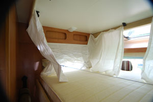 Una volta in possesso di queste misure possiamo fare alcune considerazioni: il letto basculante, infatti, nel 90% dei casi non aggiunge due posti letto, ma sostituisce la trasformazione del living permettendo di svilupparlo in modo più ergonomico e appariscente non avendo da pensare agli incastri tra cuscini. I due letti matrimoniali “a castello” che si vengono quindi a creare, sono sfruttabili in maniera diversa. Quello superiore, basculante, è il principale, offre spesso dimensioni regolari in altezza e larghezza, con materasso unico, rete a doghe e tenda di separazione. Quello inferiore, invece, è da usare per le emergenze, facendo il conto che l’altezza tra materassi e pensili inferiori è sovente anche si soli 30 cm e la distanza utile tra i pensili di destra e sinistra raramente arriva a 170 cm. Questa prova, però, serve anche a capire se il living possa essere parzialmente utilizzato con basculante abbassato (cosa rara), se sia necessario rimuoverne gli schienali per abbassare il letto superiore (cosa che quasi sempre accade), se sia possibile con il letto in posizione notte raggiungere ancora la cabina di guida.