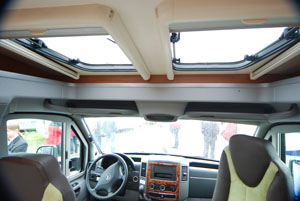 Sui veicoli di primo prezzo, le calate di raccordo con la cabina e il cupolino sono generalmente realizzati in ABS. Gli stampi, sovente giuntati tramite sigillanti butilici, sono avvitati e sigillati alle strutture portanti e hanno, quindi, una funzione prettamente estetica. La coibentazione, molto spesso, è affidata a una guaina neoprenica autoadesiva o, a volte, al classico telo a 7 strati già impiegato per la realizzazione di oscuranti termici per la cabina di guida. L’interno del cupolino, a seconda del veicolo, può essere realizzato tramite un sottile pannello in multistrato rifinito con melaminico con tinta in linea con il tetto o il mobilio (nelle versioni più economiche), o con un controstampo interno in abs di natura e fattura automobilistica per congiungere idealmente gli spazi automotive della sottostante cabina di guida. In più, un numero crescente di realizzazioni conta, ormai, sul sun-roof incorporato. Il maxi oblò panoramico, introdotto da Knaus con il Sun-Ti nel 2003 e da allora diffusosi presso quasi tutti i produttori, può essere in vetro temperato, in linea con analoghe realizzazioni automobilistiche (ad esempio Citroen e Smart), oppure a doppia lastra di metacrilato con cuscino d’aria interposto al fine di favorire la coibentazione. Spesso apribile di qualche centimetro per favorire l’aerazione, dispone solitamente di un adeguato oscurante plissettato utile per evitare i raggi solari perpendicolari quando non desiderati. Inutile negarlo, per quanto panoramico e luminoso un interno possa risultare, il sun roof è però un punto particolarmente delicato, per robustezza e coibentazione, in un’area che, data la già citata cabina di guida non coibentata, è spesso quella più soggetta ai ponti termici.