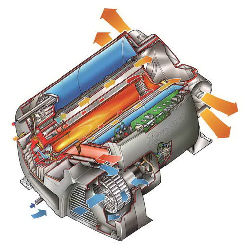Spaccato della Combi D6 che mette bene in evidenza i diversi componenti della stufa. Quello in primo piano circondato dalle frecce azzurre è il motore del ventilatore dell’aria di ricircolo che dovrà essere sostituito