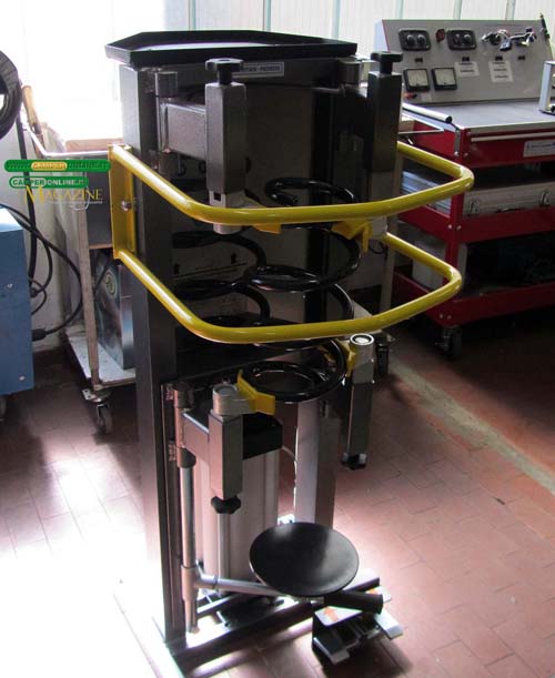 Il complesso della sospensione viene inserito nell’apposito attrezzo e si provvede a comprimere la molla in modo da poterla separare dall’ammortizzatore.