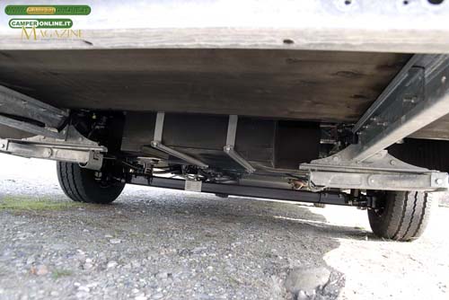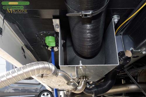 Il riscaldamento è affidato ad un Eberspaecher Airtronic D4 Camper da 4 kW alimentato a gasolio e installato sotto al pianale. E’ protetto da un apposito carter metallico e la porzione di tubazione dell’aria calda che corre all’esterno è ridotta al minimo; migliorabile la posizione della presa d’aria comburente, un po’ troppo bassa ed esposta agli agenti atmosferici.