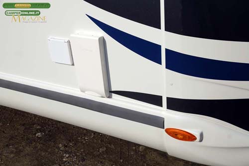 A fianco della porta, alla sua destra, si trovano la presa di corrente a 220 Volt e lo scarico del boiler, mentre alla sua sinistra, procedendo verso la coda, si incontrano prima il vano che ospita la cassetta estraibile del WC e quindi il gavone garage posteriore.