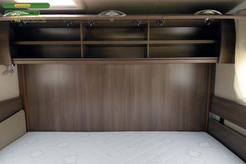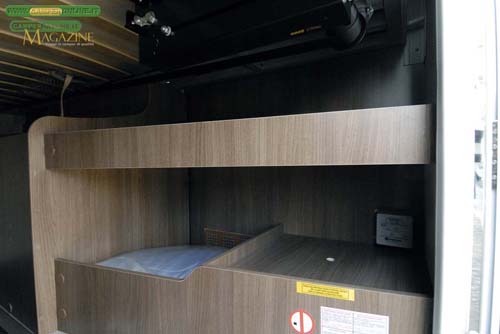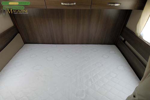 Il matrimoniale a discesa sul living è a movimentazione manuale, soluzione sicuramente da apprezzare per questa classe di veicoli, e misura 191×140 cm.
