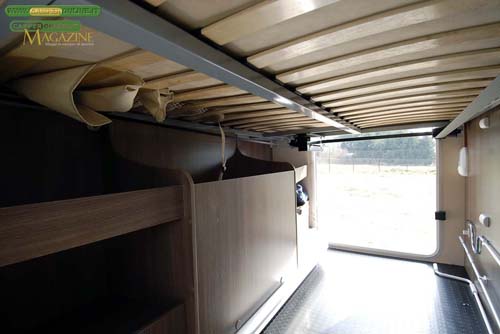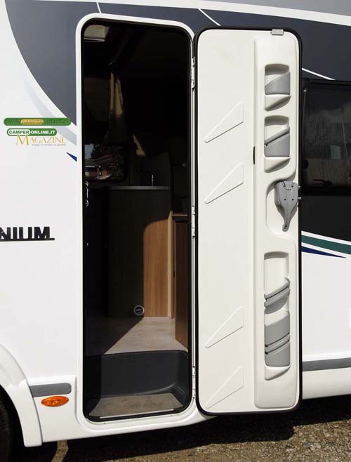 Il fondo del garage è rivestito in PVC e non dispone di fori di scolo. E’ però presente un binario predisposto ad accogliere i ganci per il fissaggio del carico e inoltre sono disponibili numerosi e comodi vani per lo stivaggio degli oggetti meno ingombranti. Non è stata prevista alcuna comunicazione con l’interno del veicolo e la soglia di accesso è posizionata a 59 cm dal suolo.