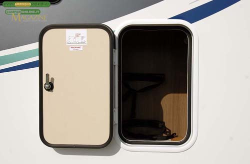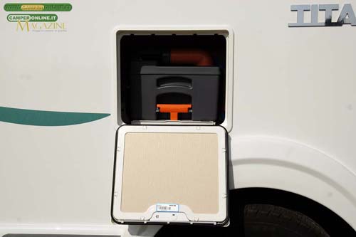 Il serbatoio di recupero da 105 litri è posizionato all’esterno, a ridosso dell’assale posteriore, con la valvola di scarico a saracinesca situata a 30 cm dal suolo. Peccato che non sia prevista, neppure come optional, la coibentazione.