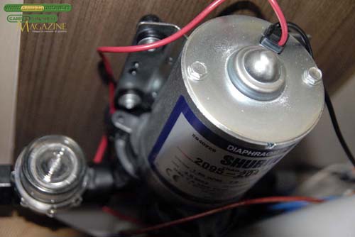 E’ parzializzabile a 50 litri per i casi in cui l’equipaggio sia al completo ed è servito da una pompa a diaframma Shurflo posizionata all’interno del piccolo vano adiacente alla semidinette.
