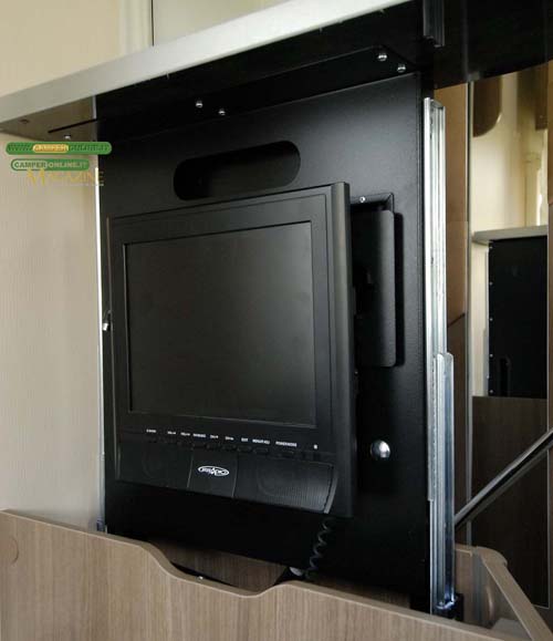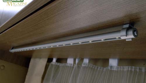 Le prese di corrente disponibili non sono molte e si riducono a due posizionate nel vano TV, per quanto riguarda il 12 Volt, e e una a 220 Volt nel pensile della cucina. L’illuminazione è interamente a Led e prevede due barre sul living, installate sotto ai pensili, e a quattro faretti sotto al letto basculante; per l’illuminazione di quest’ultimo è presente una barra a tetto.