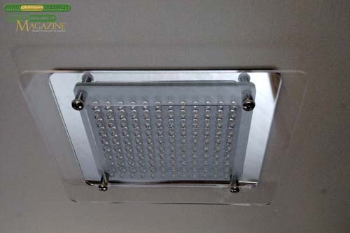 Una barra a led anche per la cucina, mentre toilette e matrimoniale posteriore si affidano entrambi a due faretti. Il corridoio è illuminato da una plafoniera quadrata.