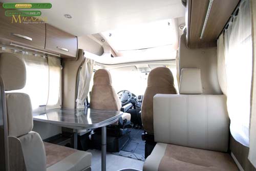 Il look esterno, moderno e aggressivo, è particolarmente riuscito e anche l’ambientazione interna, grazie al mobilio e alle inedite tappezzerie, è in grado di assicurare eleganza e un certo tocco di esclusività. I semintegrali con letto a discesa sul living hanno ormai fatto tendenza, arrivando ad appropriarsi di quelle caratteristiche che fino a pochi anni fa erano ad esclusivo appannaggio dei mansardati. Pertanto l’abitabilità di questo veicolo risulta decisamente buona, con il living in grado di accogliere comodamente anche una persona in più rispetto alle cinque per il quale il veicolo è omologato per il viaggio. La cuscineria è comoda e ottimamente imbottita, con tappezzerie robuste e di piacevole aspetto. I letti, ad esclusione ovviamente di quello ottenuto dalla trasformazione del living, sono dotati di reti a doghe e il matrimoniale posteriore offre l’indiscutibile vantaggio della regolazione in altezza. I posti letto sono addirittura sei, un vero primato, anche se i due offerti dalla trasformazione del living presentano qualche limitazione. Tra le note positive rientra sicuramente la posizione del basculante, che anche da abbassato non ostruisce la porta di ingresso.
