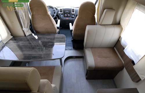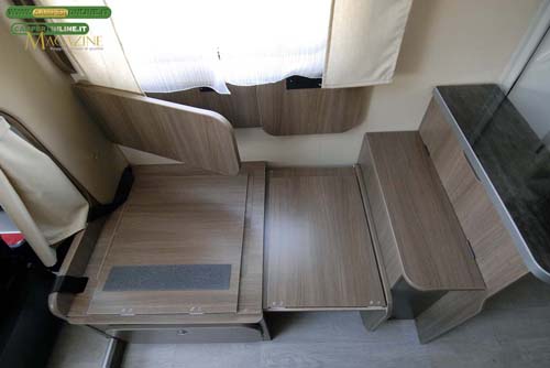 L’area living è composta dalla semidinette (104×42 cm), addossata alla parete sinistra a ridosso della cabina di guida, e da una divanetto laterale appoggiato alla parete opposta. Quest’ultimo è scomponibile per ottenere il quinto posto (contromarcia) con cintura di sicurezza.