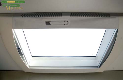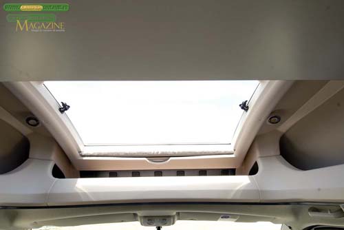A tetto non è previsto alcun oblò, in quanto sul cupolino è previsto il sun-roof apribile e per l’illuminazione ci si affida ad una barra a led installata a soffitto, sul lato sinistro. Ai lati è presente la consueta tenda perimetrale, mentre per l’accesso viene utilizzata una scaletta a pioli con agganci di sicurezza.