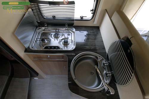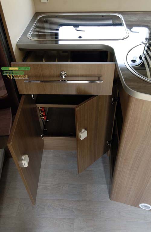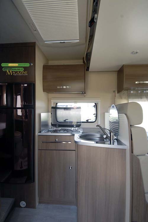 A fianco è posizionato il frigorifero Dometic RM 8555 da 190 litri e per lo stivaggio si può fare affidamento su un pensile da 55x27x34 cm, oltreché sui due vani della base da 45x46x58 e 49x40x65 e sul cassetto porta-posate da 40x45x12.