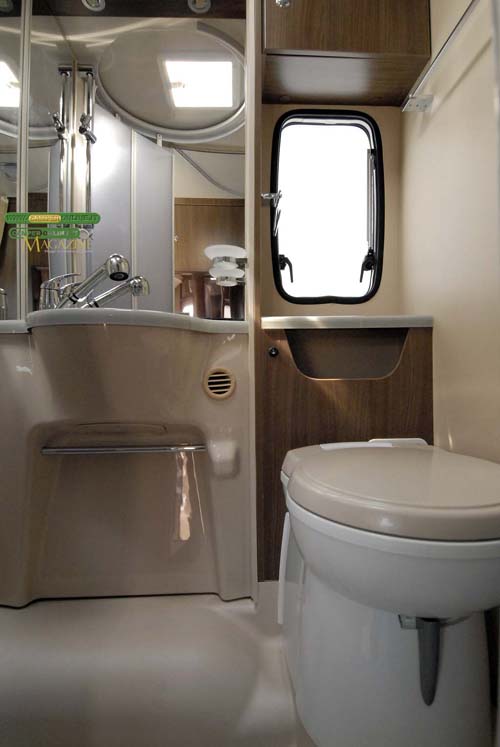 Le ottime doti di stivaggio sono leggermente compromesse nella toilette, che dispone di un unico pensile ove riporre gli articoli e gli accessori per la toeletta, anche se è presente un vano a giorno alle spalle del wc; poco apprezzabile anche la mancanza della zanzariera alla finestra. A livello di impiantistica, invece, non è molto condivisibile la scelta di non rendere possibile, neppure in opzione, la coibentazione e il riscaldamento del serbatoio di recupero delle acque grigie. Inoltre, il ricorso ad una valvola a ghigliottina sistemata direttamente sotto al serbatoio, senza alcuna tubatura che convogli lo scarico ai margini della fiancata del veicolo, rende difficoltose le operazioni di svuotamento, in quanto richiede la presenza di una persona che dia indicazioni in merito al suo corretto posizionamento sul pozzetto. Migliorabile anche il posizionamento della presa d’aria comburente del bruciatore Eberspaecher, un po’ troppo esposta alle intemperie.