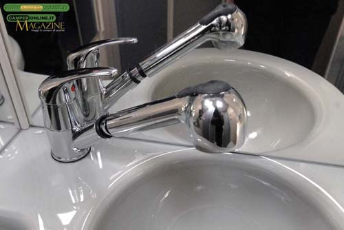 La soluzione impiegata è tra quelle care al costruttore francese e vede l’intero pavimento utilizzato come piatto doccia (due pilette le inox da 35 mm), con un intelligente sistema di antine scorrevoli che consentono di ricavare un box doccia senza rubare troppo spazio alla pianta del veicolo.