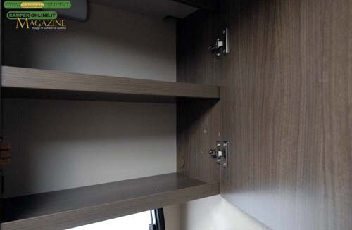 Lo stivaggio nella parte bassa è affidato ad un’unica piccola cassapanca situata tra il divanetto laterale e il mobile porta TV; coperta da un coperchio incernierato, misura 38x15x54. Nella parte alta, invece, solidali con la base del letto basculante e due per lato, sono sistemati quattro pensili, ognuno da 48x22x25 cm.