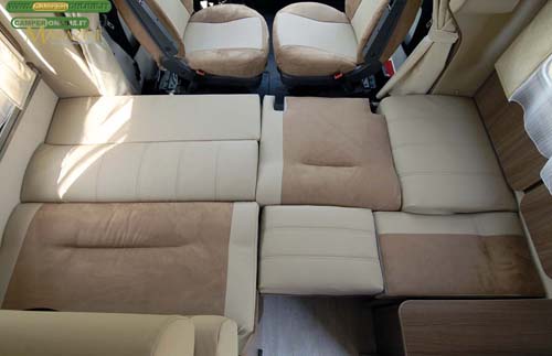 Come anticipato, il divanetto è scomponibile per ottenere il quinto posto omologato (contromarcia) con cinture di sicurezza. La trasformazione è piuttosto semplice e consiste nella rimozione dei cuscini e nella rotazione della paratia laterale, che diventa quindi il supporto per lo schienale. Inoltre è sufficiente spingere la parte mobile all’interno della cassapanca e riposizionare nel modo adeguato la cuscineria.
