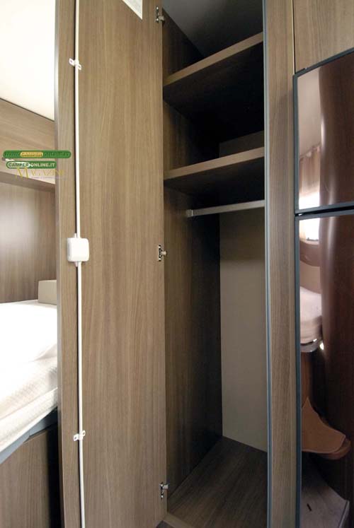 Situato tra il matrimoniale trasversale e il frigorifero, l’armadio a un anta (172×36,5 cm) chiude la rassegna di vani destinati allo stivaggio. La parte inferiore, quella destinata ad accogliere gli abiti appesi e pertanto dotata di apposita asta trasversale, misura 47x54x115 cm, mentre la parte superiore è frazionata in due vani le cui misure sono rispettivamente di 47x54x30 cm e 47x54x33 cm.
