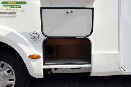 La coda del veicolo è ovviamente occupata dal garage, il cui vano misura 213x110x81-119 cm. Servito da due portelloni simmetrici da 117×82 cm con doppia serratura di sicurezza, ha il fondo in vetroresina privo di fori di scolo e dispone di ganci per il fissaggio del carico e di due plafoniere per l’illuminazione. I portelli dispongono dei consueti ganci a pressione per la posizione aperta.