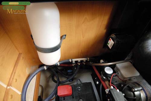Il vano portabombole è situato alla destra della porta di ingresso, in corrispondenza della poltrona del passeggero, e misura 65x32x65 cm. In posizione ribassata e con fondo in vetroresina traforata per la necessaria aerazione, è predisposto per accogliere due bombole da 10 Kg e dispone degli appositi ganci di fissaggio. Di serie sono presenti l’interruttore inerziale Secumotion e il dispositivo DuoControl per la commutazione automatica delle bombole.