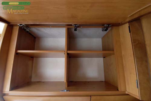 Lo stivaggio, nella parte alta, è affidato ad un pensile da 67x32x44 cm. Suddiviso a metà da un divisore e provvisto di ripiani riposizionabili privi di bordo anticaduta, ospita sotto di sé un vano da 47x17x7 cm chiuso da antina a ribalta. A fianco è situato un ulteriore stipetto da 24x45x45 con sportello ad apertura laterale.