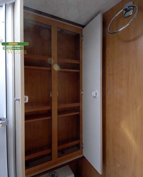 Dotato ovviamente di rete a doghe, dispone di quattro pensili da 47x30x38 cm appoggiati alla parete di coda e di due finestre Polyplastic da 75×35 cm sulle pareti laterali. A tetto è presente un oblò Remis da 40×40 cm, mentre l’illuminazione notturna è affidata a due faretti alogeni. Una piccola mensola a giorno da 55×5 cm è fissata contro la parete della toilette.