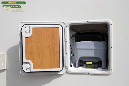 A sinistra della porta si trova invece il gavone ricavato nel doppio pavimento. Servito da un portello da 26×48 cm ad apertura verso l’alto, misura 79x45x33 cm. Nelle immediate vicinanze è posizionato il bocchettone del serbatoio dell’acqua potabile e la griglia di aerazione del frigorifero.