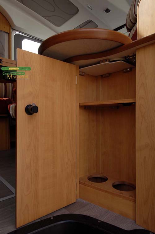 A fianco della porta di ingresso e alle spalle della poltrona del passeggero è posizionato un mobiletto portabottiglie con mensola interna. Le sue misure sono di 37x11x49 cm e nella parte superiore, in aggiunta al piano di appoggio da 51×16 cm, è possibile inserire un ripiano tondo del diametro di 37 cm.
