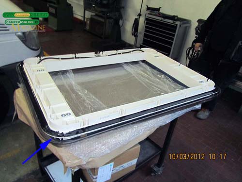 La freccia blu indica la striscia di mastice Terostat a cui è stata asportato il foglio di carta protettiva. A questo punto l’oblò Heki 3 Plus della Seitz è pronto per essere installato nella nuova sede del tetto.