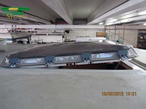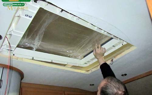 Presso l’Auto-Caravan Massaua di Torino abbiamo assistito alla sostituzione di un maxi-oblò danneggiato a causa di un colpo di vento e nella sequenza fotografica che segue sono documentate le varie fasi dell’intervento. A causa della difficoltà a reperire il ricambio originale, il centro assistenza torinese ha provveduto all’installazione di un Seitz Heki 3 Plus distribuito da Dometic. Il nuovo oblò, uno dei più noti e diffusi in commercio, ha dimensioni maggiori che hanno richiesto l’ampliamento dell’apertura a tetto e il ripristino dell’intelaiatura perimetrale di rinforzo.
