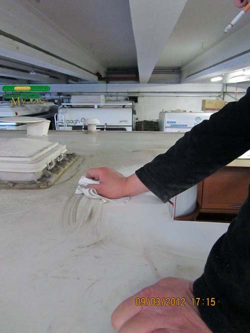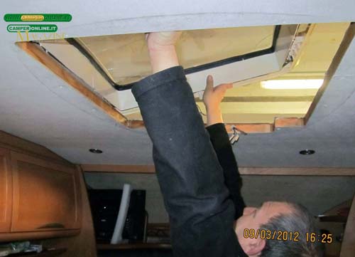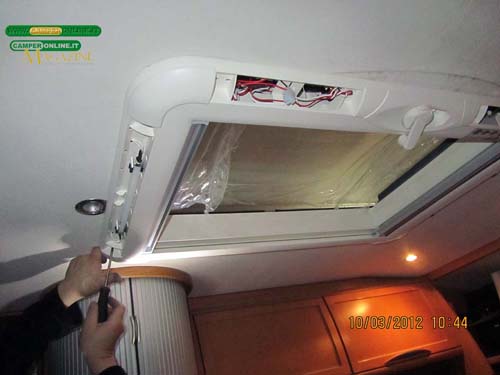 Presso l’Auto-Caravan Massaua di Torino abbiamo assistito alla sostituzione di un maxi-oblò danneggiato a causa di un colpo di vento e nella sequenza fotografica che segue sono documentate le varie fasi dell’intervento. A causa della difficoltà a reperire il ricambio originale, il centro assistenza torinese ha provveduto all’installazione di un Seitz Heki 3 Plus distribuito da Dometic. Il nuovo oblò, uno dei più noti e diffusi in commercio, ha dimensioni maggiori che hanno richiesto l’ampliamento dell’apertura a tetto e il ripristino dell’intelaiatura perimetrale di rinforzo.